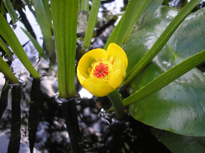 Und diese seltsame Seerose möchte ich auch einmal zeigen. Wer weiß, wie die heißt? (Die länglichen Blätter gehören zur sogenannten Krebsschere. Aber diese Blüte gehört zu den typischen Seerosenblättern.)
